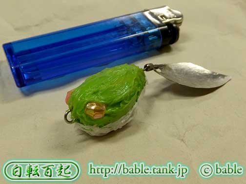 材料はバルサ材・鉄片・ステンレス針金・目玉はビーズ・スピナーブレイド・サルカン・コーティングはクリアのシリコンシーラントに絵の具を混ぜてます。前ページで紹介しているスピナーブレイドではありません。銅板でブレードを作る前に、練習のためフロッピーディスクのシャッターを加工してみた試作品が上手くいったので採用しました。