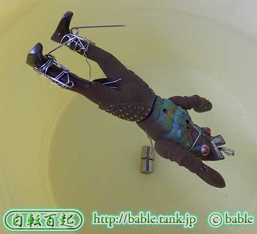 バルタン星人フィギュアの内部は空洞で使っているうちに水も入るでしょうから、水が浸入しやすい(空気が抜けやすい)ように本体に穴を空けています。両足内部にクッション材を入れてウキの働きをさせています。