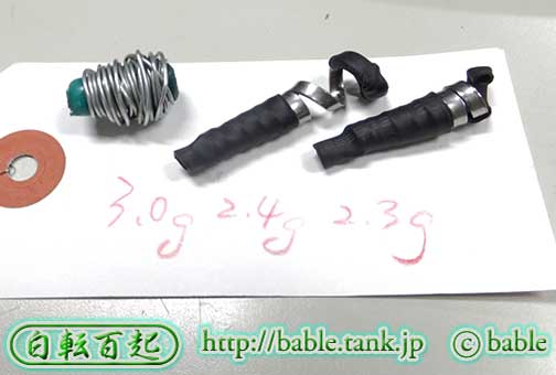 まずはファーストキャストFCS-T762L用に軽いバージョンを作ってみました。左から針金をパイプに巻いたもの、右二つは自動車ワイパーブレードのスプリング鋼を巻いたものに熱収縮チューブを被せております。