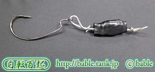 水中でフックポイントが常に上向きになるように作ってみました。実際は海藻の中を通ってくると思うので、よりスムースに抜けられるよう熱収縮チューブを被せております。これにリーダーを結んでガン玉を挟めば完成です。ガン玉は8Bを2個付け12gから始めてみようかと思案しております。