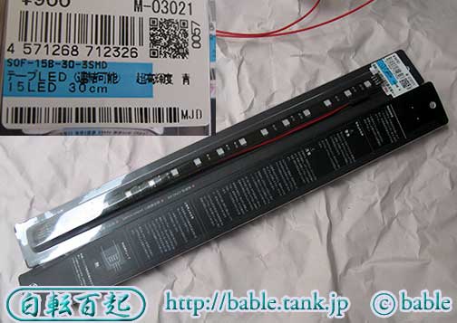「連結ができるテープ型のLEDモジュールです。 すぐに使用できるようにLEDをテープ型にしてモールドされています。 端子部分以外は防水処理が施されています。 両端は簡単に連結できるようにピンコネクタが付いています。3素子入LED×15個ですので、45素子分の明るさ」だそうです。サイズは、長さ30cm×幅12mm×厚さ3.2mm、1本900円でしたのでこれを選択。